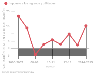 Los ingresos tributarios por la recaudación del impuesto a los ingresos y utilidades (renta) crecieron un 15,2% en términos reales durante 2015, en comparación al 2014. Este es el crecimiento en este tributo más alto registrado desde el periodo 2006-2007 cuando aumentó en un 21,7%.