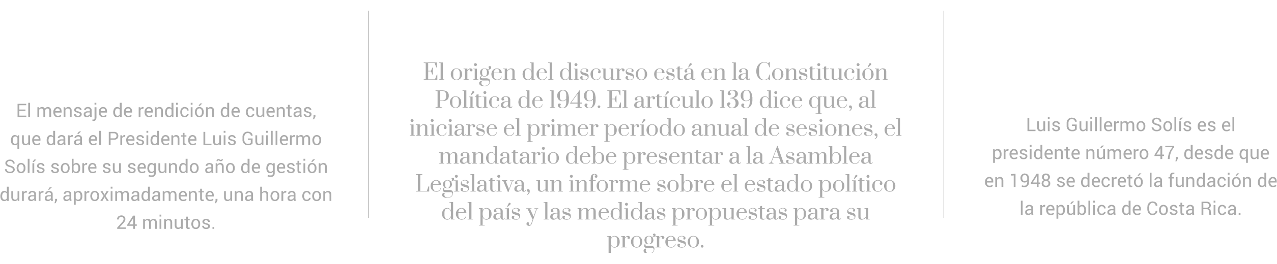 En el ejercicio de prever cuáles serían las principales cifras y logros destacados por el presidente Luis Guillermo Solís en su discurso, La Nación recopiló, con antelación, datos públicos sobre economía, empleo, seguridad, energía, educación y temas sociales. Con ese insumo se verificaron, en tiempo real, 23 de las afirmaciones del mensaje presidencial de este 2 de mayo. Aquí, cifras, gráficos y contexto usado para calificar a esas aseveraciones como: ciertas, ciertas pero, o falsas.