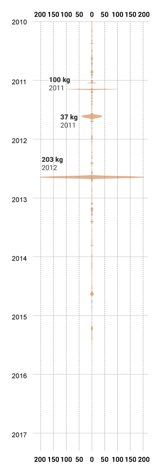 Este gráfico le permite conocer detalle de cada uno de los 517 decomisos internacionales de cocaína procedente de Costa Rica. Seleccione una de las categorías para visualizar, únicamente, los datos relacionados a ese medio de transporte.