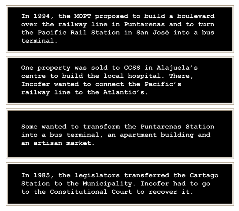 In 1989, Incofer sold part of the property of the Atlantic Rail Station, in San José, to the Central Bank. The ¢171 million (¢2.600 million today), were used to pay overdrafts to banks, a month of salaries and to collect materials from the extinct Southern Railway.