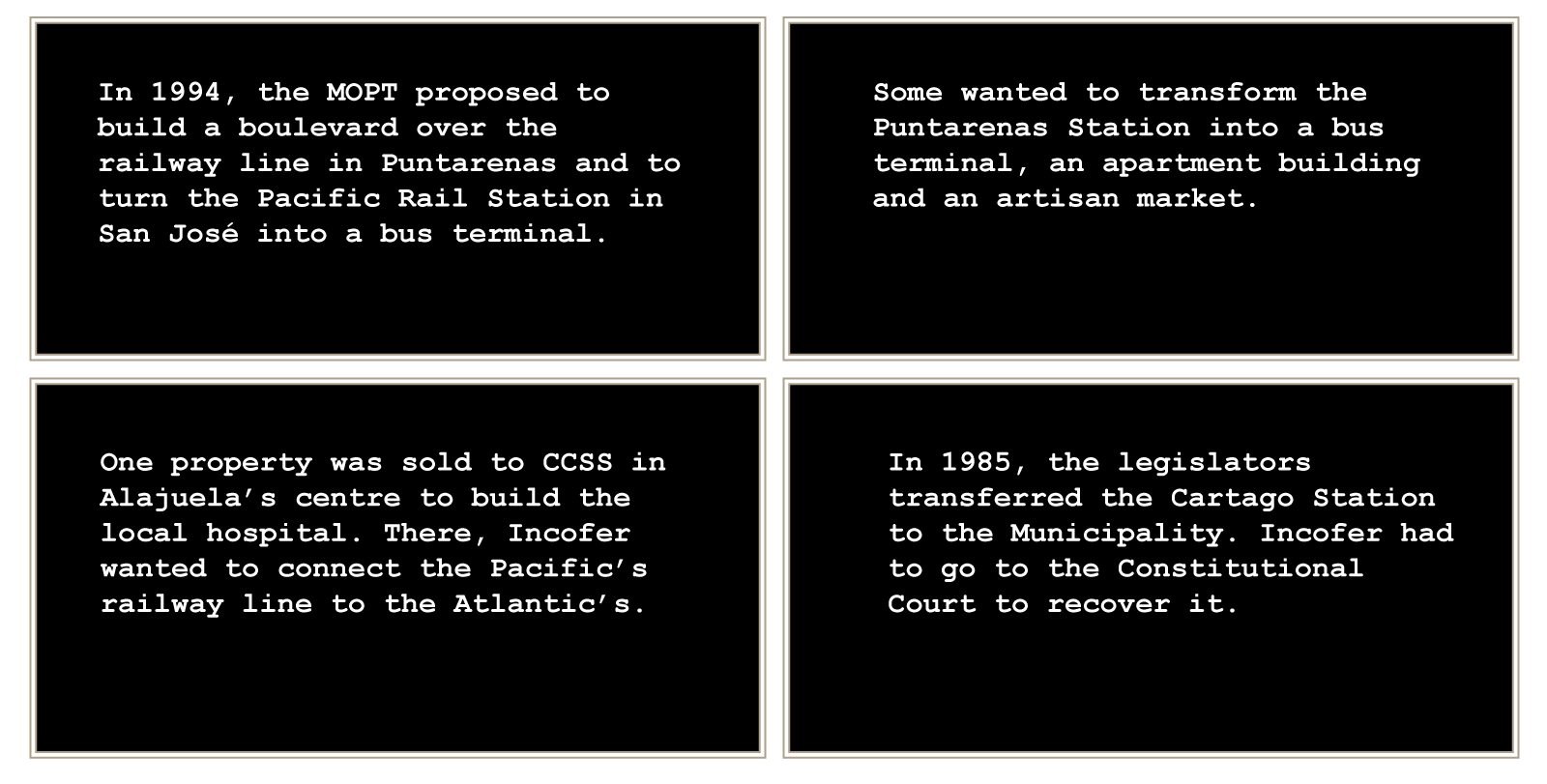 Incofer (Instituto Costarricense de Ferrocarriles [Costa Rican Institute of Railways] Directing Council’s Minutes from 1985 to 2010, Minutes of the Directing Council of Fecosa (Ferrocarriles de Costa Rica) [Railways of Costa Rica, Fecosa, for its acronym in Spanish] from 1977 to 1985, Minutes of the Electric Railway to the Pacific 1949, Minutes of the Governing Council 1986-1987, Statistical Yearbooks of the Ministerio de Obras Públicas y Transportes [Ministry of Transport and Public Works, MOPT, for its acronym in Spanish], Archives of La Nación, Calderón, N., Solano A. & Ugalde, J. (2002). Análisis de las causas que llevaron al cierre del Instituto Costarricense de Ferrocarriles (Incofer) (Analysis of the causes that led the closure of the Costa Rican Institute of Railways), Year 1995. Ciudad Universitaria Rodrigo Facio (University city Rodrigo Facio)., Gómez, C. (1987). Análisis de la flota de transporte de carga en Costa Rica [Analysis of the cargo transport fleet in Costa Rica]. Graduation Project in Civil Engineering --Universidad de Costa Rica [University of Costa Rica –UCR, for its acronym in Spanish]. Faculty of Engineering, Department of Civil Engineering, 1987., Interviews to former presidents and former railway employees as well as to the deputy vice-minister of the presidency.