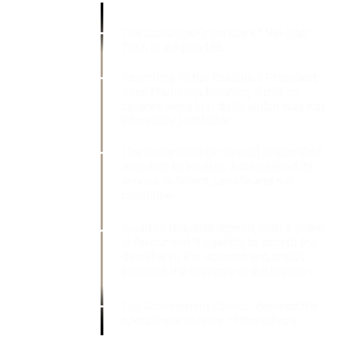 On May 1994, José María Figueres Olsen became president of Costa Rica. His administration kept the railway barely alive for 12 months, but finally defined its future.