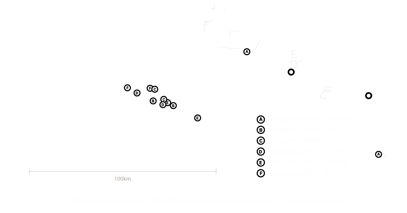 Between 1998 and 2016 283.5 kilometres of railway line have been reactivated. This represents a fourth of the total railway line, which has around 1,100 kilometres of extension.