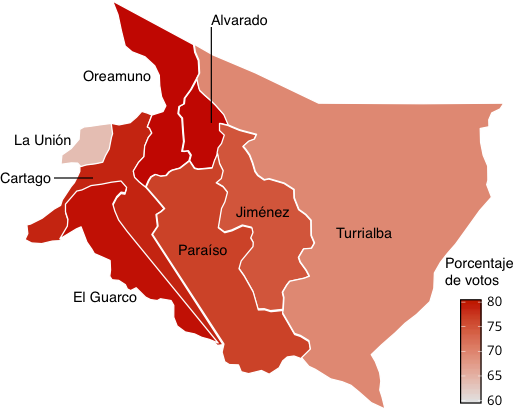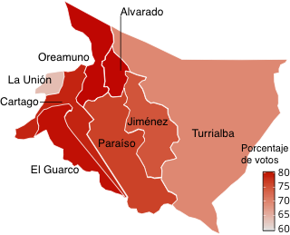 Mientras, los cantones cartagineses de Alvarado, Oreamuno, El Guarco, Paraíso y Cartago, así como los municipios de Belén, León Cortés, Tarrazú, Puriscal y Acosta los ganó por una diferencia superior a 50 puntos.