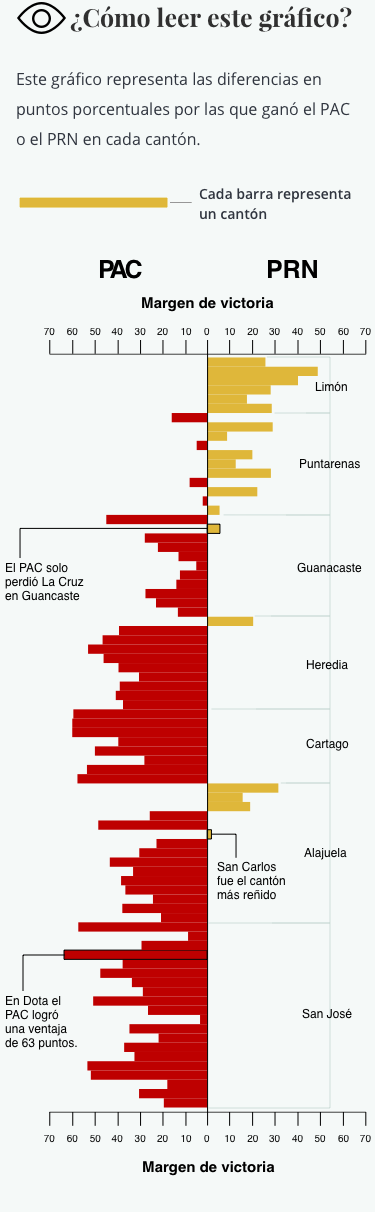 En 56 de estos municipios el triunfo del oficialismo fue contundente: le sacó entre 12 y 63 puntos porcentuales de ventaja a su rival. En otros seis cantones, el PAC logró una diferencia de entre 1,9 y 8,4 puntos.