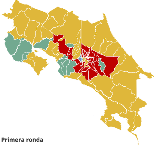 Del lado del PAC, la victoria más rotunda, con 63,3 puntos de ventaja, se registró en el cantón de Dota, que también había favorecido al PAC en la primera ronda. El partido de gobierno tiene una organización bien cimentada en ese municipio.