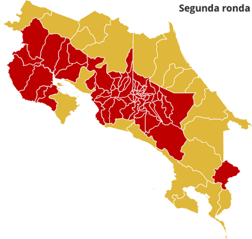 En esta disputa, los rojiamarillos ganaron ocho de los diez cantones con mayor cantidad de electores en el país, que juntos representan el 40% de los sufragios a nivel nacional. En la primera ronda, habían perdido cinco de estos territorios frente al PRN.