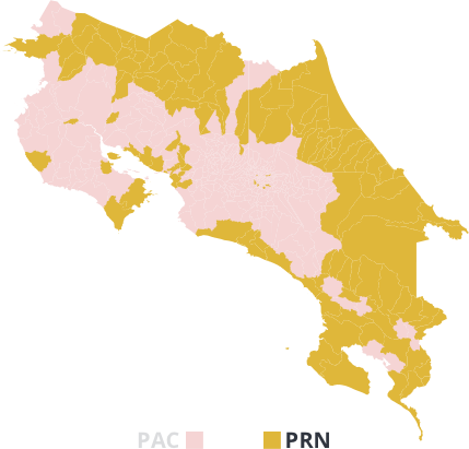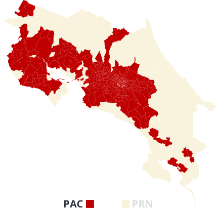 Al PAC le dieron la espalda los votantes de 125 de los 483 distritos del país (26%). En esos territorios, venció el Partido Restauración Nacional, de la mano del cantante y exdiputado Fabricio Alvarado.