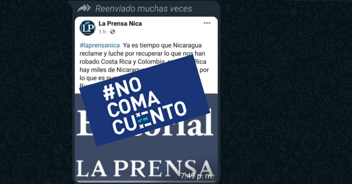 El diario La Prensa, de Nicaragua, desmintió una imagen que se divulgó ampliamente en grupos de WhatsApp de ese país con un supuesto llamado del medio de comunicación a que los nicaragüenses “luchen” contra Costa Rica, siguiendo el ejemplo de la invasión de Ucrania por parte de Rusia.