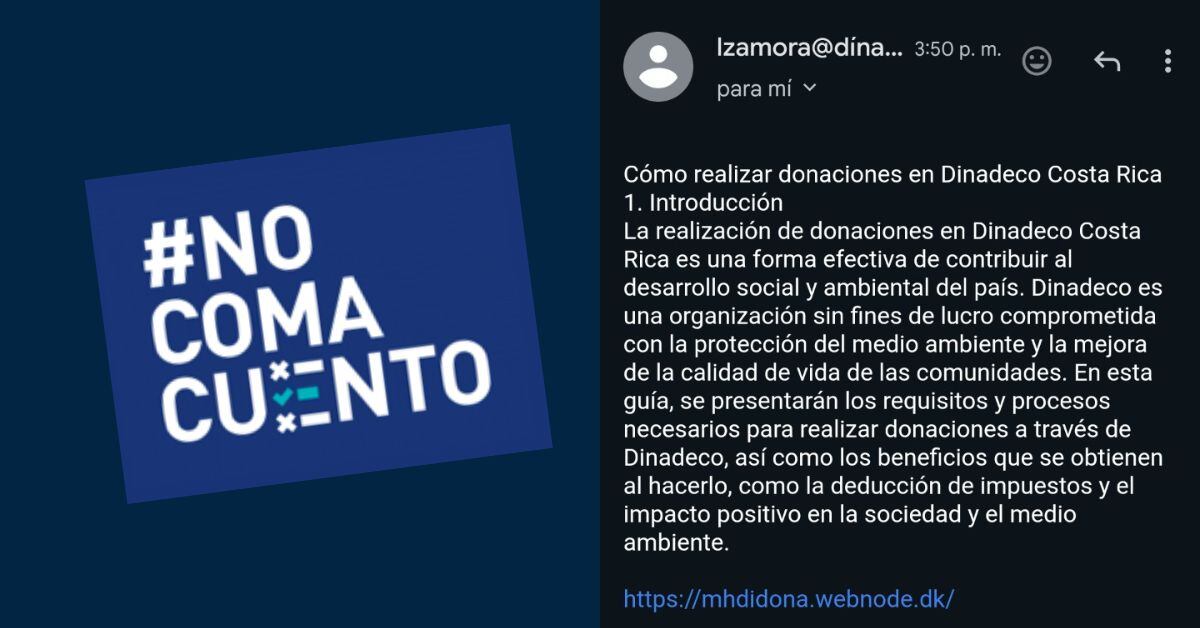 La Dirección Nacional de Desarrollo de la Comunidad (Dinadeco) no está enviando correos electrónicos ni realizando llamadas telefónicas para ofrecer donaciones a miembros de asociaciones de desarrollo y organizaciones comunales. Se trata de una estafa.