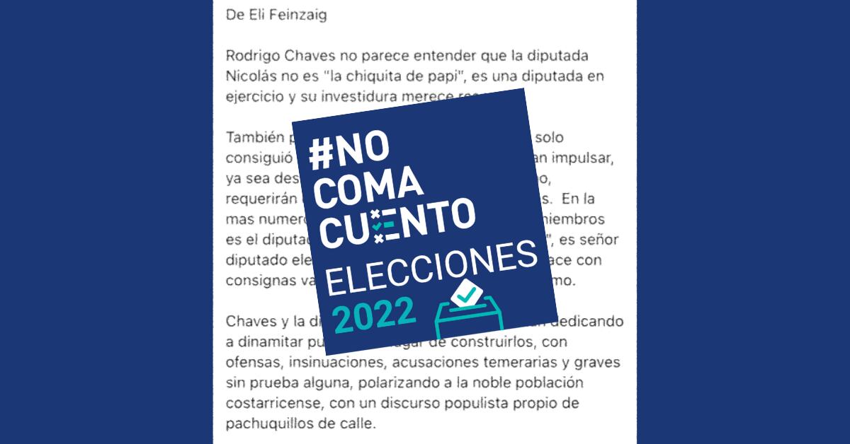 En su publicación, Leonardo Feinzaig fustigó declaraciones que dio el candidato presidencial Rodrigo Chaves, del Partido Progreso Social Democrático (PPSD), durante una gira a Puntarenas, el pasado fin de semana, en las que atacó a la actual diputada Franggie Nicolás y a su papá, Francisco Nicolás, quien asumirá una curul por la provincia de Puntarenas a partir del próximo 1.° de mayo.