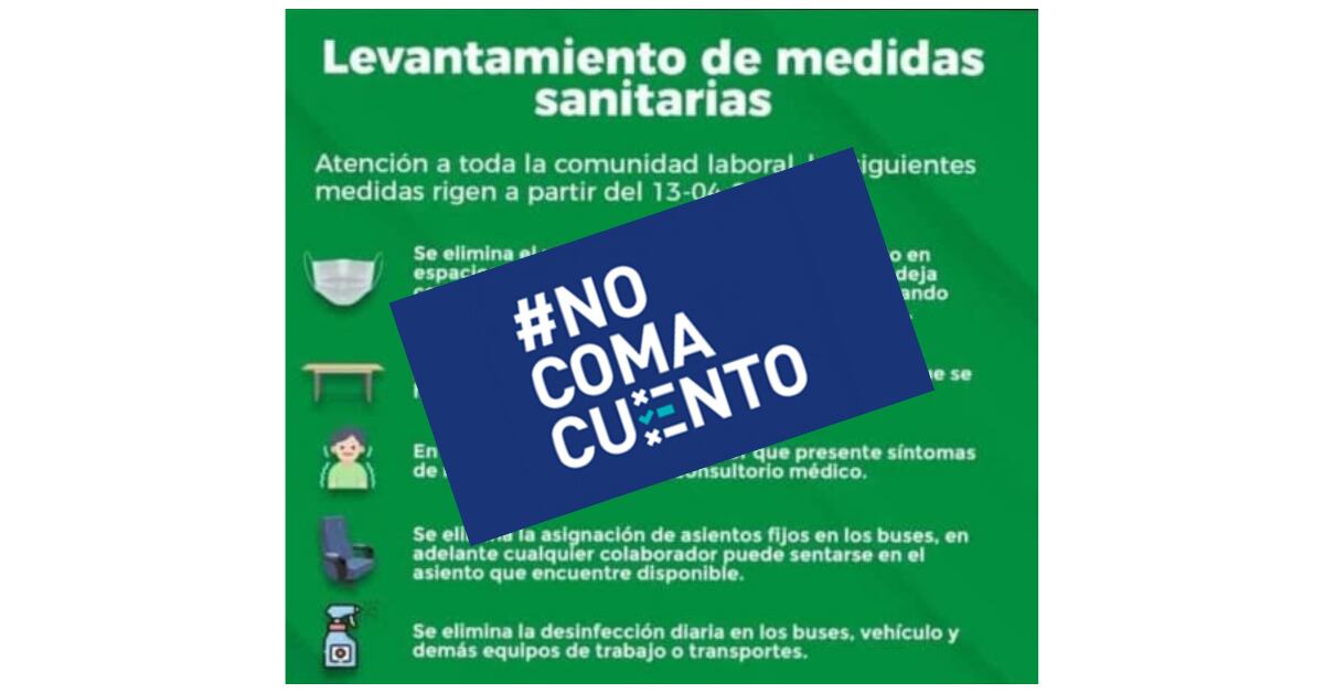 La imagen que se comparte en chats (con fondo verde, letras blancas e íconos en el margen izquierdo), afirma que, supuestamente, el uso de mascarillas en lugares cerrados y abiertos, así como otras medidas, se levantaron para la “comunidad laboral” desde el 13 de abril. Añade que los cubrebocas podrán seguirlos adquiriendo y utilizando quienes así lo deseen.