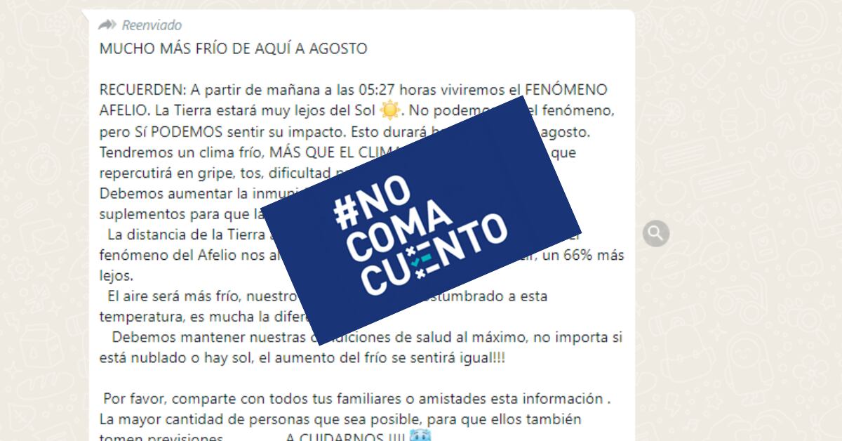 Un mensaje que circula masivamente en WhatsApp afirma que “a partir de mañana” y hasta agosto, el tiempo estará mucho más frío de lo normal, al punto de causar gripe, tos y dificultad para respirar. Según la cadena, esto sucederá a causa del “fenómeno afelio”, el cual, supuestamente, hará que la Tierra se aleje muchísimo del Sol.