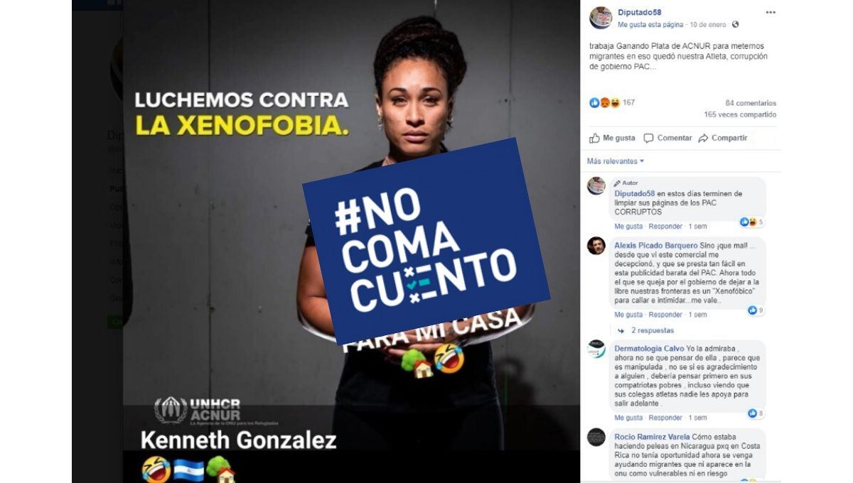 “Trabaja ganando plata de Acnur para meternos migrantes, en eso quedó nuestra atleta, corrupción de gobierno PAC”, se lee en otra publicación compartida el 10 de enero en una página que se identifica como Diputado58 y que ya se reprodujo 165 veces.