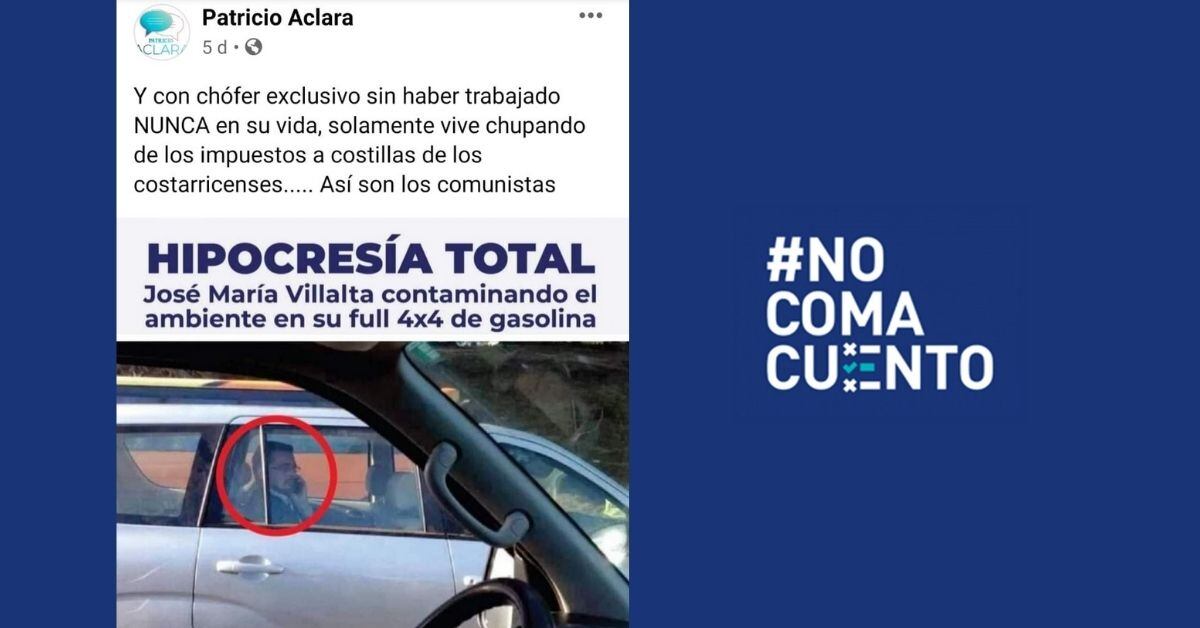 La página de Facebook Patricio Aclara utiliza una fotografía tomada hace ocho años para acusar al diputado y candidato presidencial José María Villalta, del Frente Amplio, de “hipocresía”, por, supuestamente, trasladarse en su propio vehículo 4x4 y con un “chofer exclusivo”.