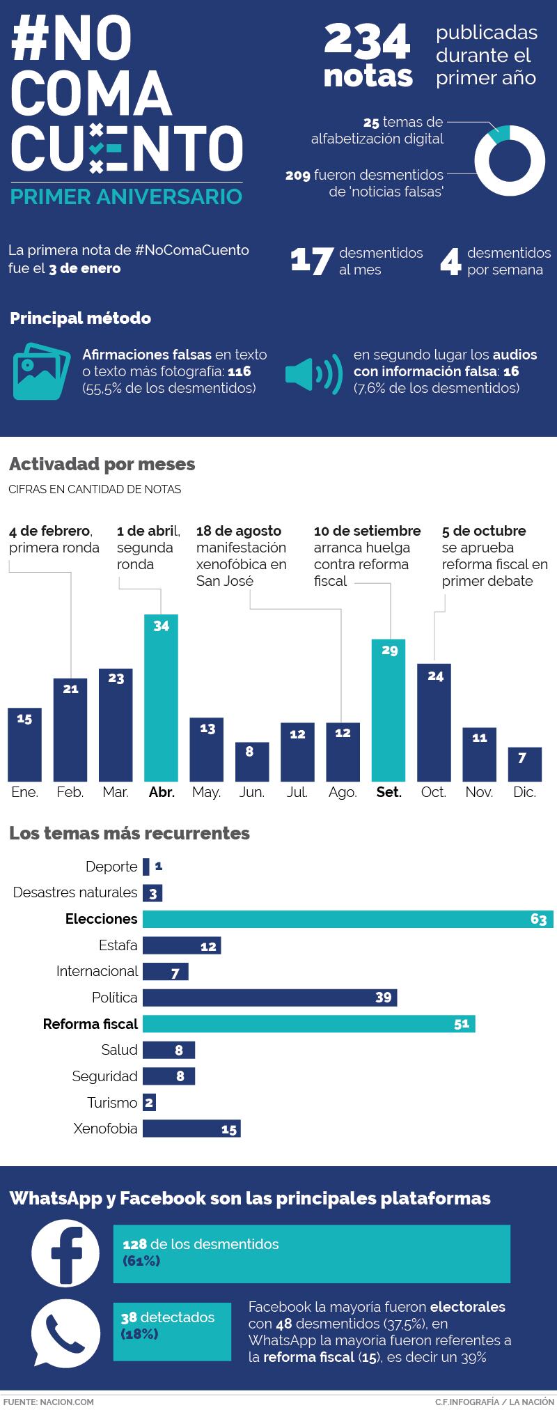 Los meses en que más se desmintieron "noticias falsas” fueron abril con 34 (16%) y setiembre con 29 (14%). En abril, se realizó la segunda ronda electoral en la que resultó triunfador el hoy presidente Carlos Alvarado, mientras que en setiembre empezó la huelga contra la reforma fiscal, que se prolongó por 89 días.