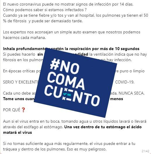 "Inhala profundamente y aguanta la respiración por más de 10 segundos. Si puedes hacerlo sin toser, sin incomodidad, congestión u opresión, esto demuestra que no hay fibrosis en los pulmones, lo que básicamente indica que no hay infección”, dice la cadena de mensajes con información falsa.