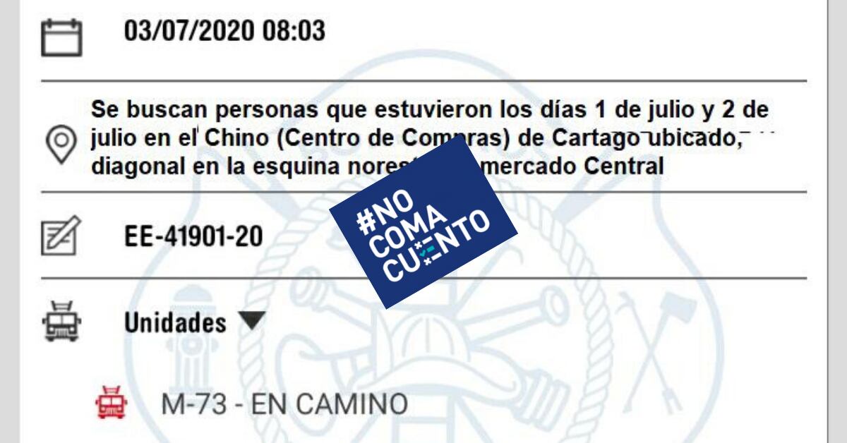 El Cuerpo de Bomberos de Costa Rica aclaró que es falsa una supuesta alerta que circula en redes sociales, en la que se busca a posibles contactos de un caso de covid-19 en Cartago.