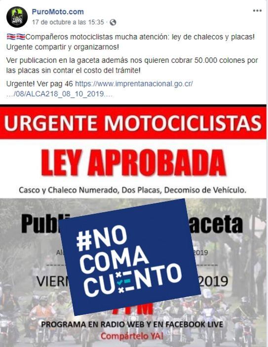 “Urgente motociclistas, ley aprobada: casco y chaleco numerado, dos placas, decomiso de vehículo”, dice la publicación errónea.