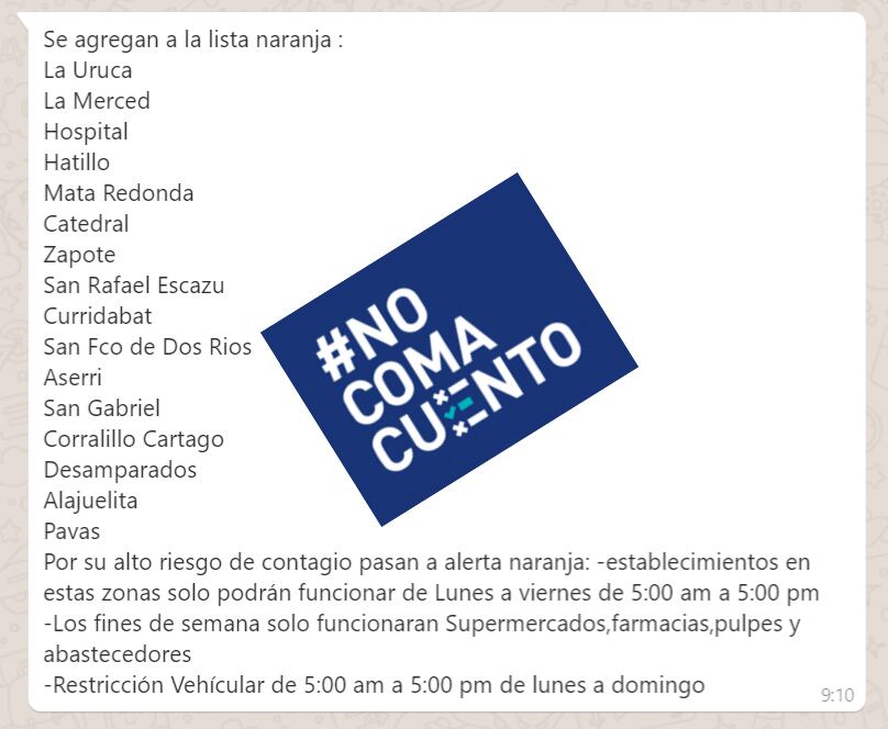 En los cantones y distritos bajo alerta naranja se aplica la restricción vehicular nocturna de lunes a domingo de 5 p. m. a 5 a. m., no de 5 a. m. a 5 p. m como asegura la cadena de mensajes.