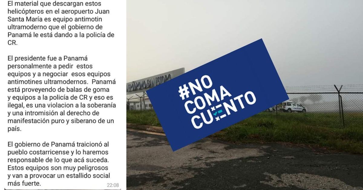 La publicación con información errónea incluye dos fotografías en las que, supuestamente, se observa cómo policías de la Fuerza Pública descargan el “equipo" panameño en el aeropuerto Juan Santamaría.