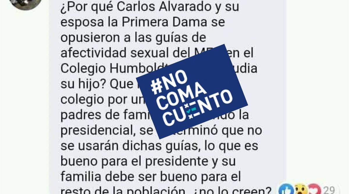 No es cierto que el presidente Carlos Alvarado y la primera dama, Claudia Dobles, se opusieron a que su hijo recibiera los contenidos de los programas de Educación para la Afectividad y Sexualidad Integral del Ministerio de Educación Pública (MEP).