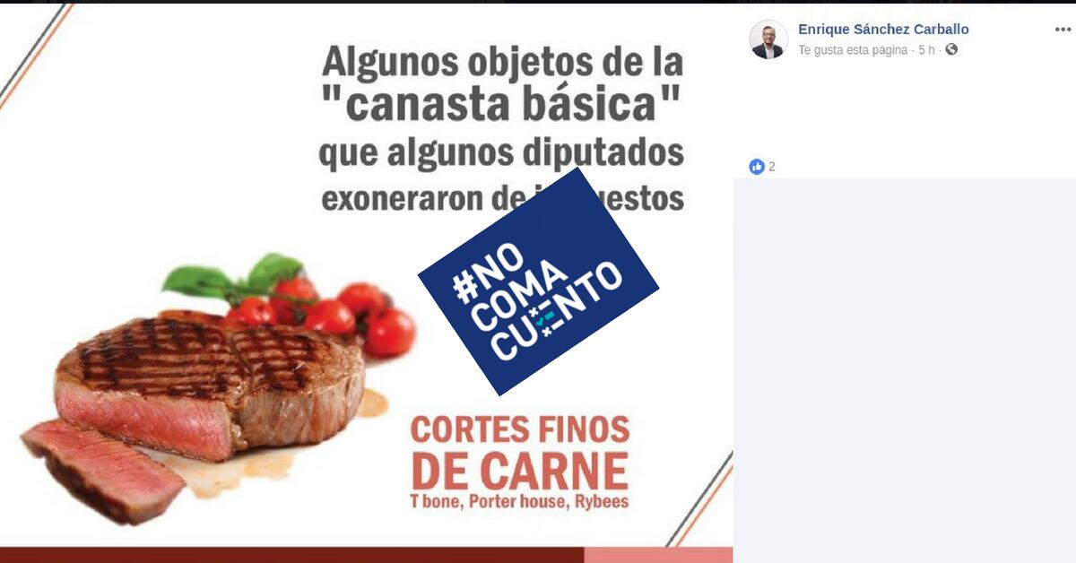 Una de los montajes, que también está circulando en varias páginas de Facebook, afirma que los “cortes finos de carne” T-bone, Porterhouse y ribeye forman parte de la canasta básica que fue exonerada del impuesto al valor agregado (IVA), por un grupo de diputados de oposición, este miércoles.