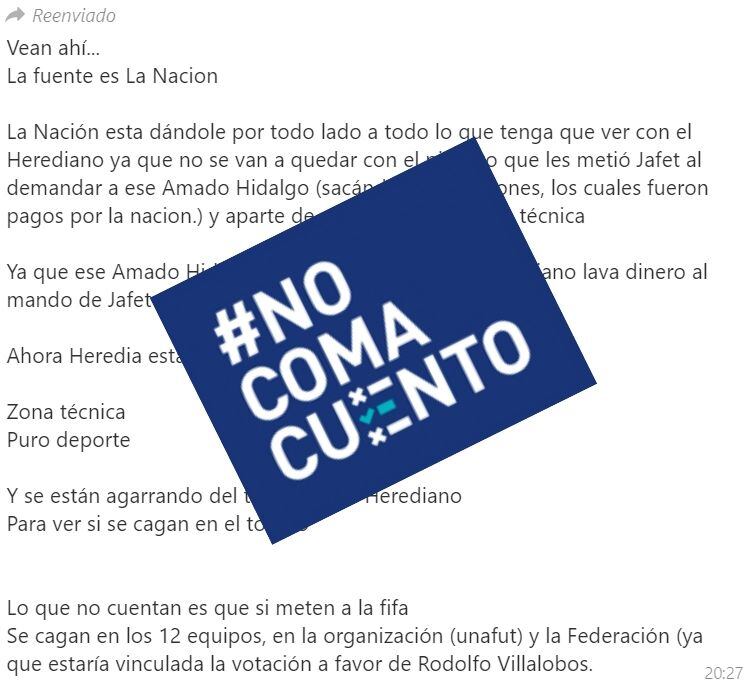 Los mensajes falsos también afirman que las publicaciones de La Nación son una revancha. Aseguran que el periodista Amado Hidalgo perdió una demanda ante Jafet Soto y que este periodico deberá pagar ¢100 millones al gerente del Team por ese proceso.