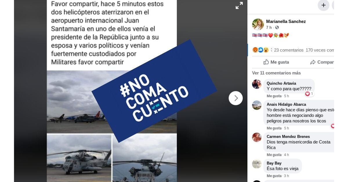 “Nuestra página no emite comentarios políticos, pero si queremos aclarar que esas fotos corresponden a la visita de dos Sikorsky CH-53 en Agosto del año pasado. En la publicación mencionada anteriormente se aprecia un Boeing 737 de Sun Country que no es un visitante regular en el Aeropuerto Juan Santamaría, su llegada coincidió con la de los helicópteros de los Marines”, explicó AviacionCR.net.