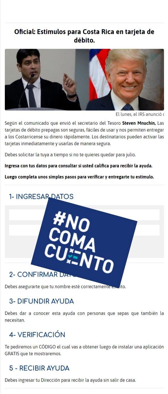 El portal al que dirigen los mensajes incluye fotografías del presidente de la República, Carlos Alvarado y del mandatario estadounidense, Donald Trump, así como una comunicación falsa que se le adjudica, erróneamente, al Gobierno de los Estados Unidos.