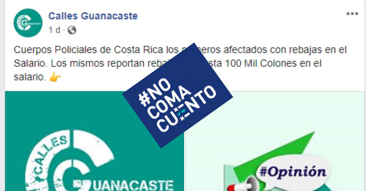 “Cuerpos policiales de Costa Rica los primeros afectados con rebajas en el salario. Los mismos reportan rebajas de hasta 100 mil colones en el salario”, asegura el posteo con información falsa realizado por “Calles Guanacaste”, portal que es seguido por más de 280.000 personas.