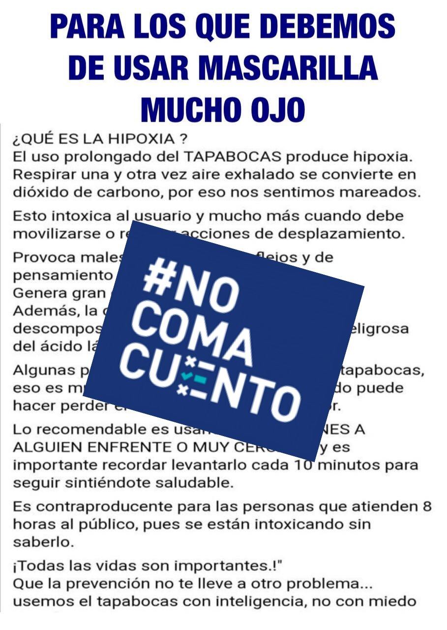 Los mensajes erróneos también le recomiendan a las personas levantarse la mascarilla cada 10 minutos para evitar la supuesta condición, consejo que no es respaldado por la Organización Mundial de la Salud (OMS).
