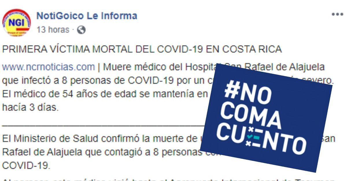 “Primera víctima del covid-19 en Costa Rica”, dice el posteo, en el cual se asegura que quien murió fue un médico del Hospital San Rafael de Alajuela portador del virus.
