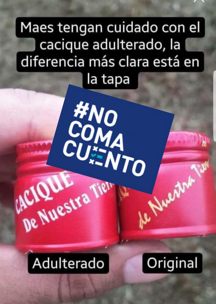 “Maes tengan cuidado con el Cacique adulterado, la diferencia más clara está en la tapa”, dice la gráfica con información errónea.