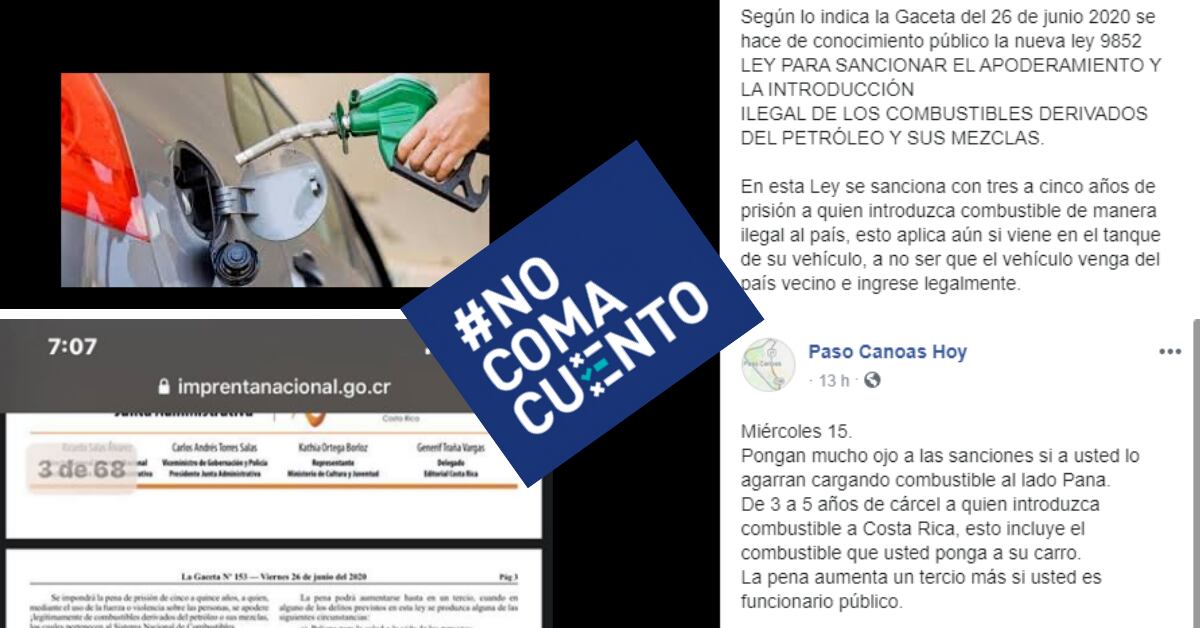 En los posteos se afirma que con la entrada en vigencia de la ley 9852, Ley Para Sancionar El Apoderamiento y La Introducción Ilegal de Los Combustibles Derivados Del Petróleo y sus Mezclas, se aplicarán penas de cárcel a quienes compren en Panamá gasolina para sus vehículos.