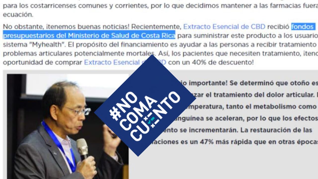 La publicación engañosa se aloja en un sitio identificado como MyHealt y erróneamente informa: “Extracto Esencial de CBD (el aparente medicamento) recibió fondos presupuestarios del Ministerio de Salud de Costa Rica para suministrar este producto a los usuarios".