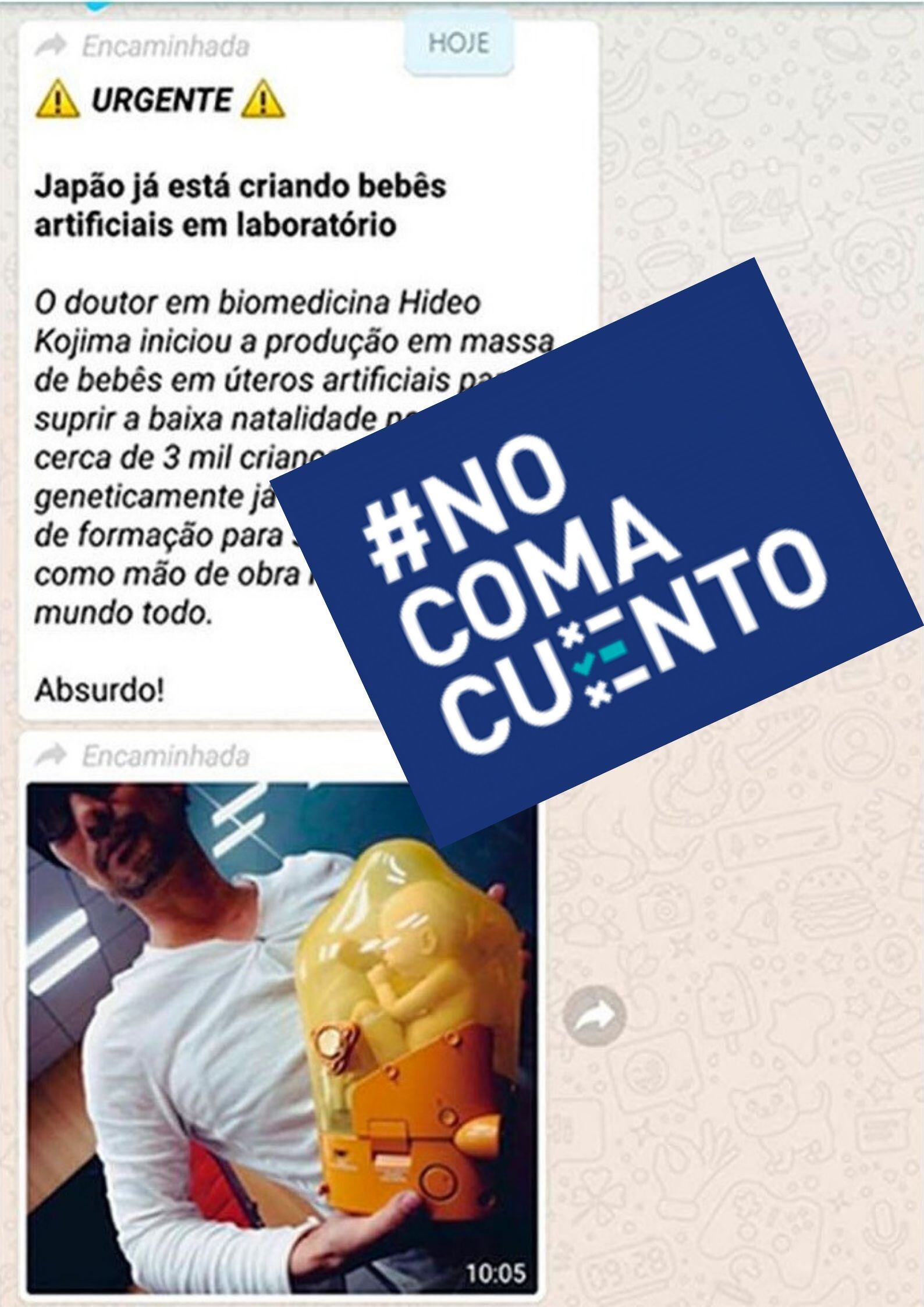 “Un doctor en biomedicina llamado Hideo Kojima inició la producción en masa de bebés en úteros artificiales para suministrar la baja tasa de natalidad de Japón, unos 3.000 niños modificados genéticamente, ya están en proceso de capacitación para ser utilizados como mano de obra en fábricas de todo el mundo. Absurdo”, afirma, por ejemplo, un mensaje que se comparte mediante WhatsApp en Brasil y que ya fue desmentido por medios de comunicación de ese país.