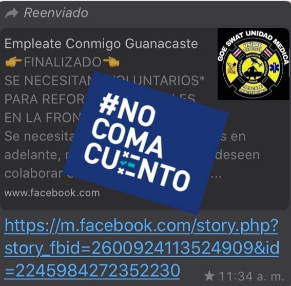 Esta información forma parte del proyecto #NoComaCuento, una iniciativa de La Nación que busca analizar la veracidad de la información que circula en redes sociales. Usted puede formar parte de este proyecto enviándonos información que le parezca falsa o poco confiable al WhatsApp 6420-7160 o al correo nocomacuento@nacion.com.