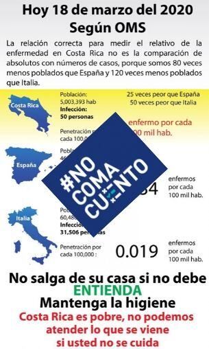 Los números erróneos se utilizan para hacer una comparación engañosa con la tasa de contagio en Costa Rica, que en la actualidad es de 1,3 por cada 100.000 habitantes (con 69 casos confirmados).