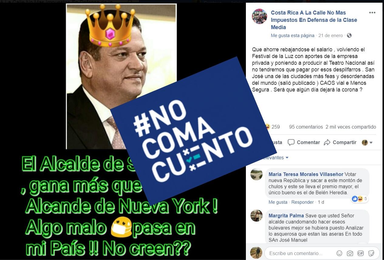 #NoComaCuento desmintió, en setiembre anterior, otra información errónea referente al salario del alcalde josefino, en ese momento se afirmaba que Araya ganaba ¢16 millones al mes.