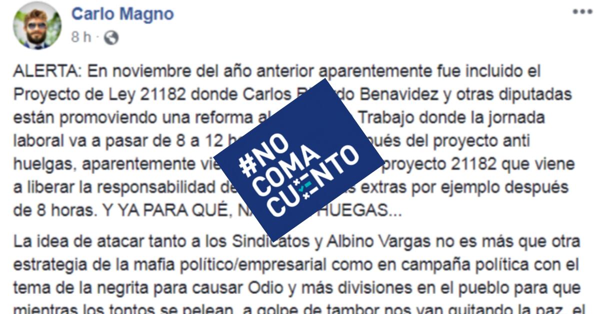 “ALERTA: En noviembre del año anterior aparentemente fue incluido el Proyecto de Ley 21.182 donde Carlos Ricardo Benavides y otras diputadas están promoviendo una reforma al Código de Trabajo donde la jornada laboral va a pasar de 8 a 12 horas diarias. Después del proyecto antihuelgas, aparentemente viene en discusión este proyecto 21.182 que viene a liberar la responsabilidad del pago de horas extras por ejemplo después de 8 horas. Y YA PARA QUÉ, NADA DE HUELGAS...”