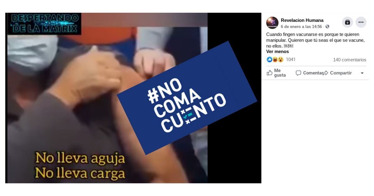 El audiovisual “vacuna show”, de cuatro minutos y 15 segundos, asegura erróneamente que las vacunaciones reportadas por los medios de comunicación se ha realizado con jeringas sin aguja, sin líquido o con la tapa puesta.