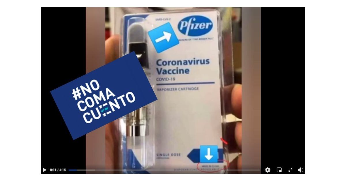 La primera imagen que muestra el video es falsa. Se trata de una fotografía de un producto cuyo empaque supuestamente dice “vacuna del coronavirus”, con el logo de Pfizer y una etiqueta que dice “hecho en China”.