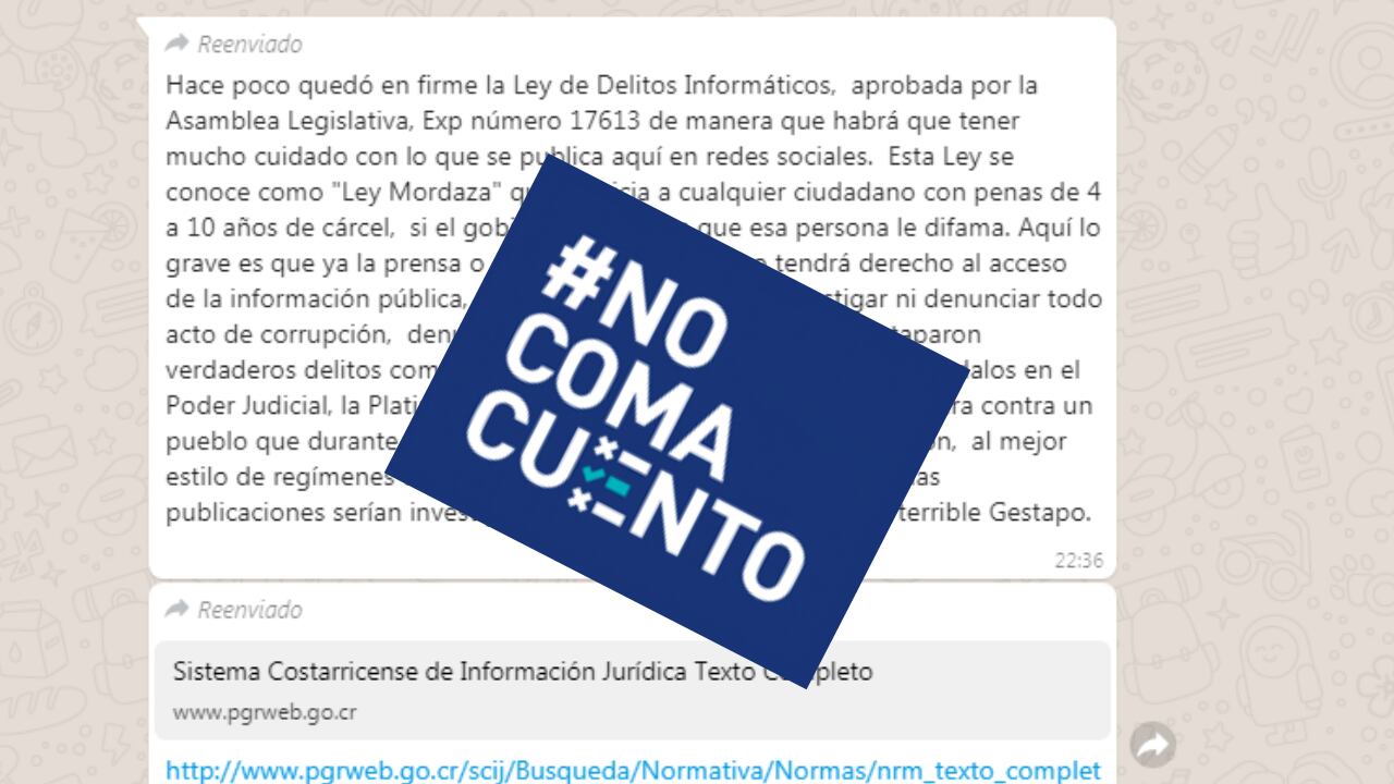 El mensaje erróneo señala: “Hace poco quedó en firme la Ley de Delitos Informáticos, aprobada por la Asamblea Legislativa, expediente número 17613, de manera que habrá que tener mucho cuidado con lo que se publica aquí en redes sociales. Esta ley se conoce como “Ley Mordaza” que enjuicia a cualquier ciudadano con penas de 4 a 10 años de cárcel, si el Gobierno considera que esa persona le difama.