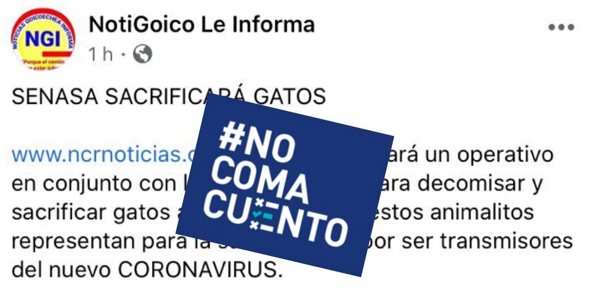 “Senasa empezará un operativo con la Fuerza Pública para decomisar y sacrificar gatos ante el riesgo que estos animalitos representan para la salud pública por ser transmisores del nuevo CORONAVIRUS”, dice la publicación falsa que también circula como una imagen vía WhatsApp