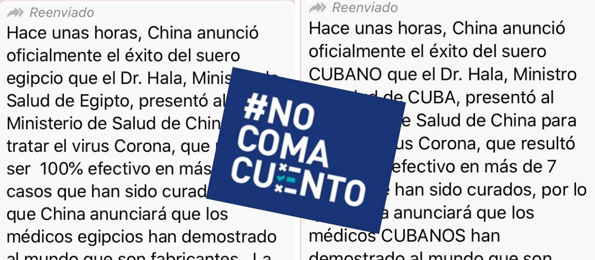 Según la información falsa, el supuesto ministro de Salud de Egipto o Cuba, dependiendo de la versión de la cadena, de nombre Hala, presentó el suero y China confirmó que es 100% efectivo para curar el coronavirus.