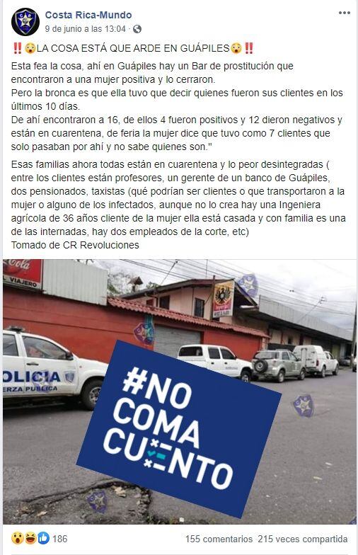 “La cosa está que arde en Guápiles. Está fea la cosa, ahí en Guápiles hay un bar de prostitución que encontraron a una mujer positiva y lo cerraron. Pero la bronca es que ella tuvo que decir quiénes fueron sus clientes en los últimos 10 días”, dice uno de los posteos que se comparte de forma masiva en redes sociales.