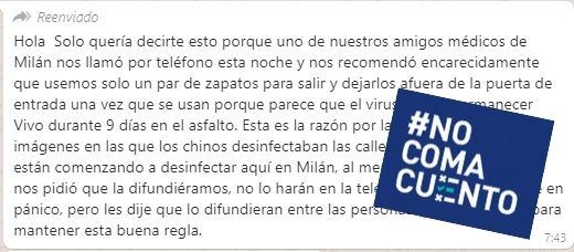 “Uno de nuestros amigos médicos de Milán nos llamó por teléfono esta noche y nos recomendó encarecidamente que usemos solo un par de zapatos para salir y dejarlos afuera de la puerta de entrada una vez que se usan porque parece que el virus puede permanecer vivo durante 9 días en el asfalto”, dicen los mensajes, sin fundamento.