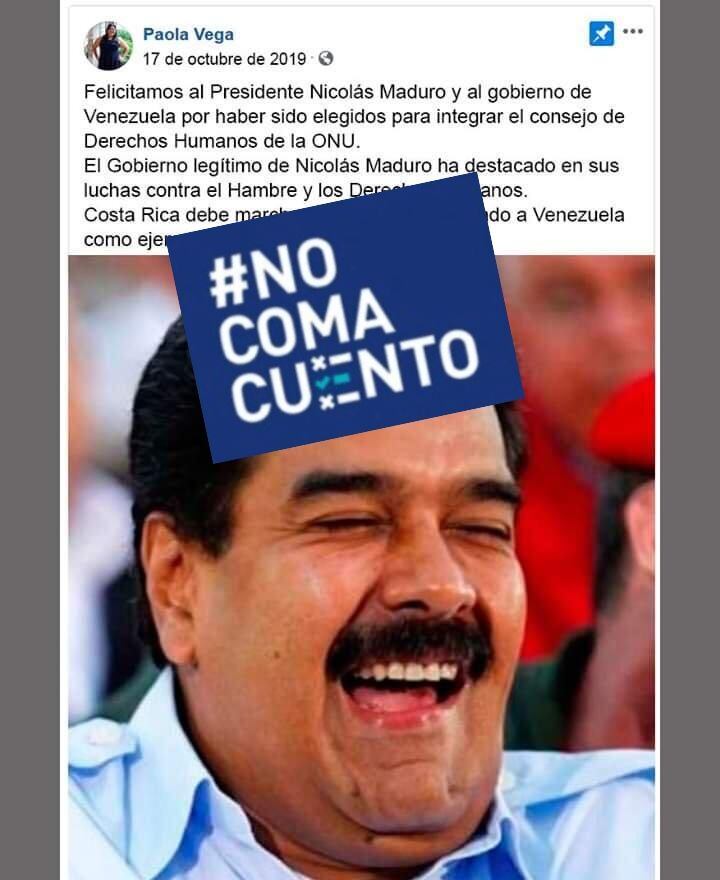 La diputada del Partido Acción Ciudadana (PAC) Paola Vega no felicitó, en sus redes sociales, al mandatario venezolano Nicolás Maduro por la obtención de un puesto en el Consejo de Derechos Humanos de Naciones Unidas (ONU), como hace creer un montaje que se comparte en Facebook y WhatsApp.