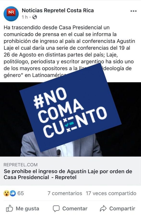 Esta información forma parte del proyecto #NoComaCuento, una iniciativa de La Nación que busca analizar la veracidad de la información que circula en redes sociales. Usted puede formar parte de este proyecto enviándonos información que le parezca falsa o poco confiable al WhatsApp 6420-7160 o al correo nocomacuento@nacion.com.